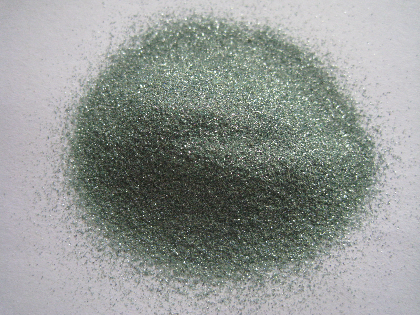 綠碳化硅是以石油焦和優質硅石為主要原料,添加食鹽作為添加劑,在電阻爐內經高溫冶煉而成。呈綠色結晶,性脆而鋒利,并具有一定的導熱性和導電性。微觀形狀呈六方晶體,碳化硅的莫氏硬度為9.3,顯微密硬度為2940—3300kg/mm2,努普硬度為2670—2815kg/mm2,在磨料中高于剛玉而僅次于金剛石、立方氮化硼和碳化硼。密度一般認為是3.20-3.25g/cm3.碳化硅磨料的自然堆積密度在1.2--1.6g/cm3之間,比重為3.20~3.25g/cm3